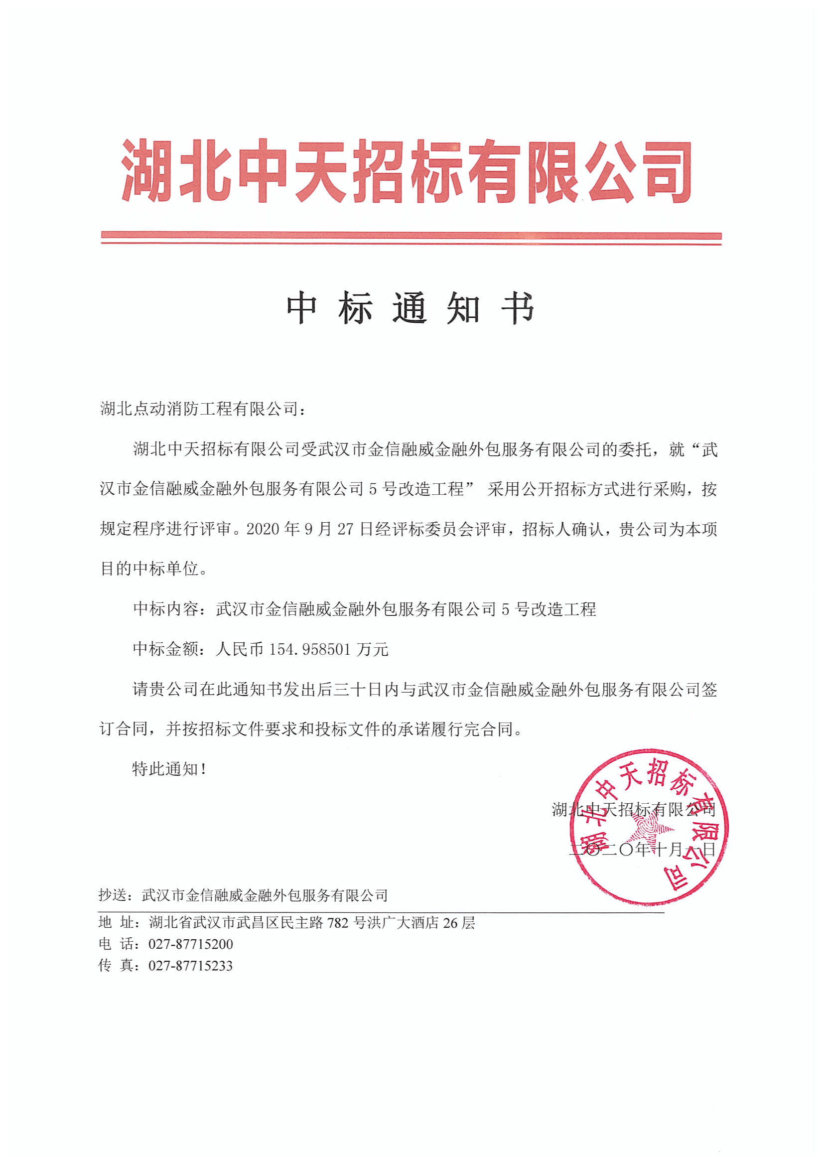 近日,在武漢市武昌區(qū)民主路782號宏光大酒店26層實施的“武漢市金信融威金融外包服務公司5號改造工程)””項目中,我們一舉中標。